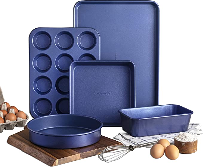 Looking for a new bakeware set that will make your baking experience easier and more enjoyable? Look no further than the Granitestone Ultra Nonstick Bakeware Set! This 5-piece set includes a muffin pan, baking pan, loaf pan, round baking tray, and baking sheet, all made with the unique nonstick technology. Looking for a new bakeware set that will make your baking life easier? Look no further than the Granitestone Blue Bakeware Set! This set is constructed from solid aluminum and coated with a special mineral infusion that makes it practically non-stick. No more need for baking sheets, oil or butter - everything just slides right off the surface. It`s also ultra durable and long lasting, with a best-in-class 0.8mm thick gauge that won`t warp or flex, even after years of use. And because it`s metal utensil safe, you don`t have to worry about scratching the surface. Ournonstick coating is unlike anything on the market, and it ensures even heating and no Warp technology for outstanding results every time. The dishwasher-safe design makes cleanup a breeze, and the sleek granite stone finish will look great in your kitchen. Whether you`re a beginner baker or a pro, the Granitestone Ultra Nonstick Bakeware Set is the perfect choice for anyone who wants to create delicious baked goods with ease. Order yours today!